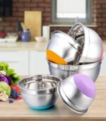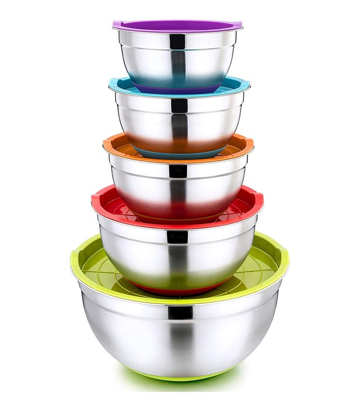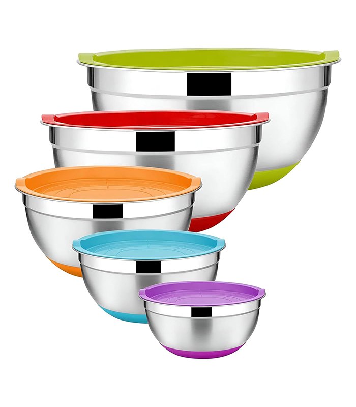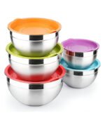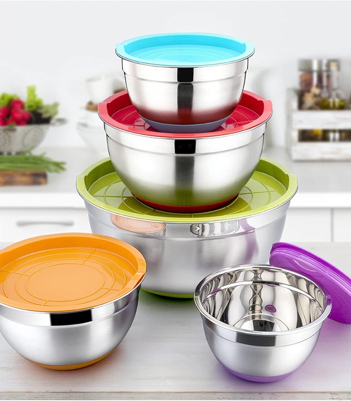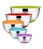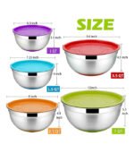 طقم تلاجة 5 قطع استانليس مستورد – من الفولاذ المقاوم للصدأ مع أغطية لخلط وتخزين الطعام، بقاعدة سيليكون غير قابلة للانزلاق