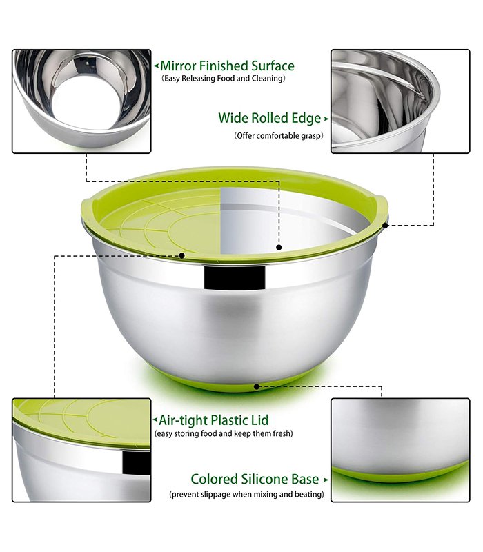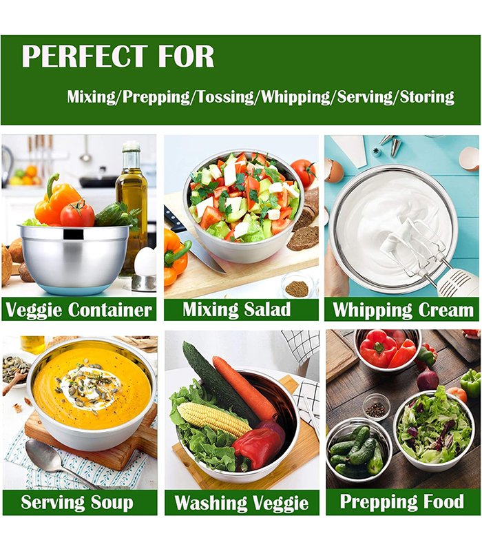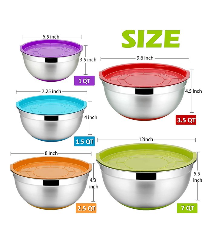 - (متعددة الوظائف) تأتي مجموعة أوعية الخلط هذه بسعة 1، 1.5، 2.5، 3.5، 7 كوارت، 5 أوعية مختلفة الأحجام باستخدامات متعددة في مطبخ منزلك ومطعمك ومقصفك، مثل إعداد الطعام أو تخزين بقايا الطعام أو خلط السلطة أو خفق البيض أو تقديم الحساء.