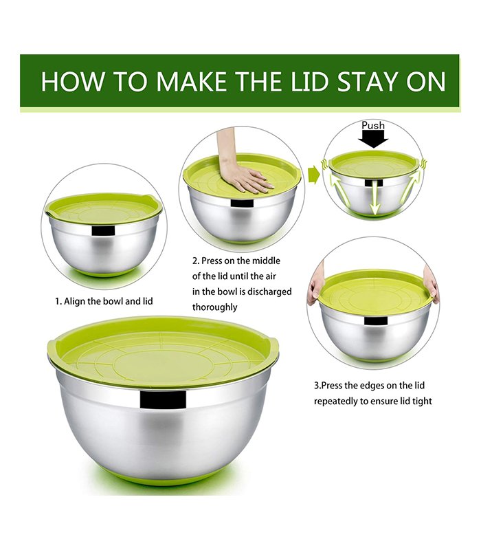 - (تفاصيل دقيقة) يمكن أن تلبي التفاصيل الدقيقة لمجموعة أوعية السلطة احتياجاتك في مناسبات مختلفة، غطاء بلاستيكي يتناسب بإحكام مع الأوعية لسهولة تخزين الطعام والحفاظ عليه طازجًا وجافًا. الجزء السفلي المسطح من السيليكون يمنع الانزلاق أو التذبذب عند تقليب السلطة أو خلطها، كل لون يمثل مقاسًا واحدًا، ويتوافق لون الغطاء مع الجزء السفلي لسهولة المطابقة والعثور عليه.