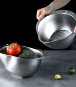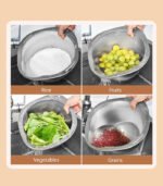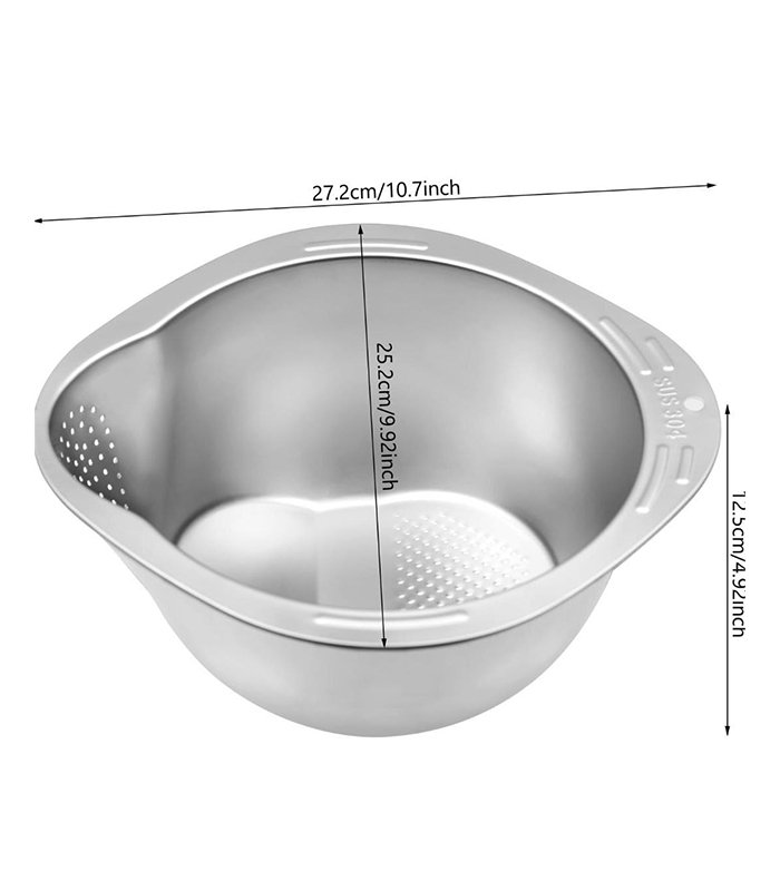 مصفاة أرز بفتحة تصريف جانبية، وعاء غسيل الأرز مع صفاية لتنظيف الفواكه والخضروات – مقاس 27سم (فضي)