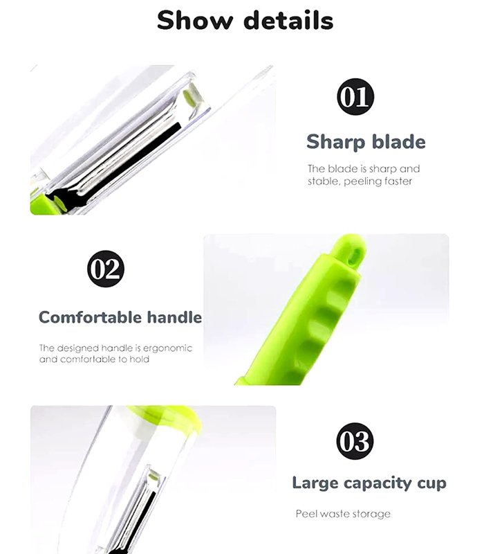 - مقشرة خضروات 3 في 1 – يمكن لمقشرة البطاطس تقشير الجلد بسرعة، ويمكن لصندوق التخزين أن يمنع القشر المقشرة من التناثر في المكان. ستبقى في صندوق التخزين بدلاً من سقوطها على الأرض، مما يحافظ على مطبخك نظيفًا وصحيًا.